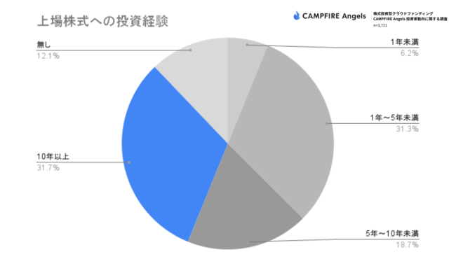 登録投資家の79.7%が「非上場株式投資は未経験」と回答しました。一方、上場株式への投資経験は31.7%が「10年以上」となっております。
