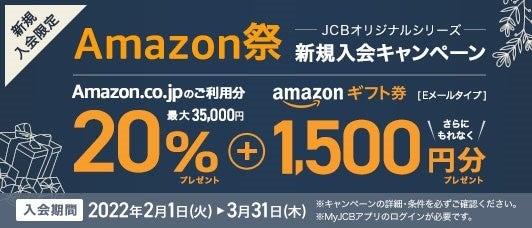 株式会社ジェーシービー (本社:東京都港区、代表取締役会長兼執行役員社長:浜川 一郎、以下:JCB)は、2022年2月1日(火)から3月31日(木)の期間中、JCBオリジナルシリーズに新規入会された方に対し、Amazon.co.jpでのお買い物におけるご利用で最大35,000円キャッシュバック&Amazonギフト券1,500円分をプレゼントするキャンペーンを実施します。