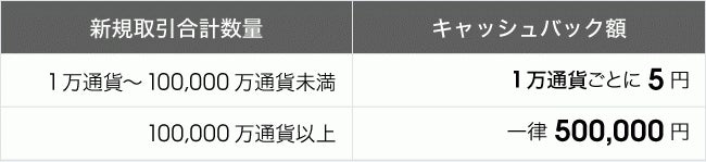 新規取引合計数量が10,000万通貨 >>> 50,000円キャッシュバック
