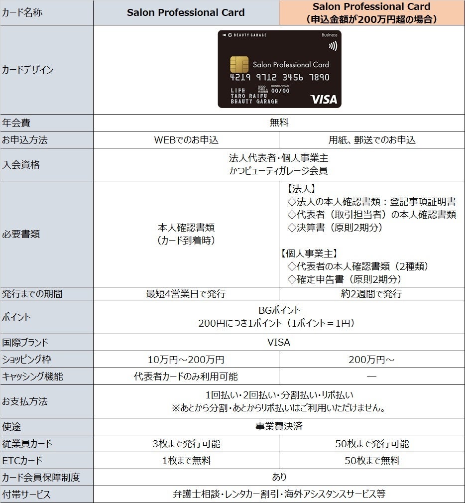 Salon Professional Card(サロンプロフェッショナルカード)は、理美容・エステ・ネイルなどの美容サロンを経営する事業者さまやフリーランスの方向けのビジネスカードであり、ビューティガレージでのお買い物はもちろんのこと、他店でのお買い物でもBGポイントがたまる、事業費決済専用のビジネスカードになります。