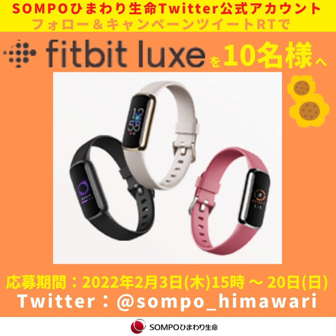 SOMPOひまわり生命保険株式会社(社長:大場 康弘、以下「当社」)は、2022年2月3日(木)15時から2月20日(日)23時59分まで、「SOMPOひまわり生命の健康応援!TwitterでFitbit Luxeを10名様にプレゼントキャンペーン」を実施します。公式Twitterアカウント『@sompo_himawari』 をフォロー&キャンペーンツイートをリツイートされた方の中から10名様にFitbit Luxeをプレゼントします。