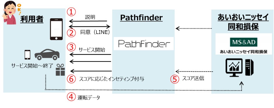 Pathfinderが提供する片道専用レンタカーマッチングサービス”Simpway”を利用するドライバーへ、あいおいニッセイ同和損保のテレマティクス技術を提供し、算出された運転スコアを基に、コンビニ等で利用可能なクーポン券を付与することで、危険挙動削減等の行動変容を促します。また、併せてあいおいニッセイ同和損保は新たなモビリティサービスにテレマティクス技術を活用することによるお客さまの利便性・有用性を検証します。