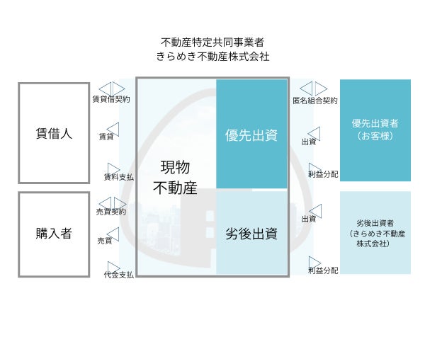 事業者となる当社は匿名組合をたて投資家様は当社と匿名組合契約を締結したのち、出資金をお支払い頂きます。投資家様は優先出資者となり賃料等から得る利益を予定分配率に至るまで優先的に分配されます、当社は劣後出資者となり、優先出資者の配当後の分配となるスキームです。