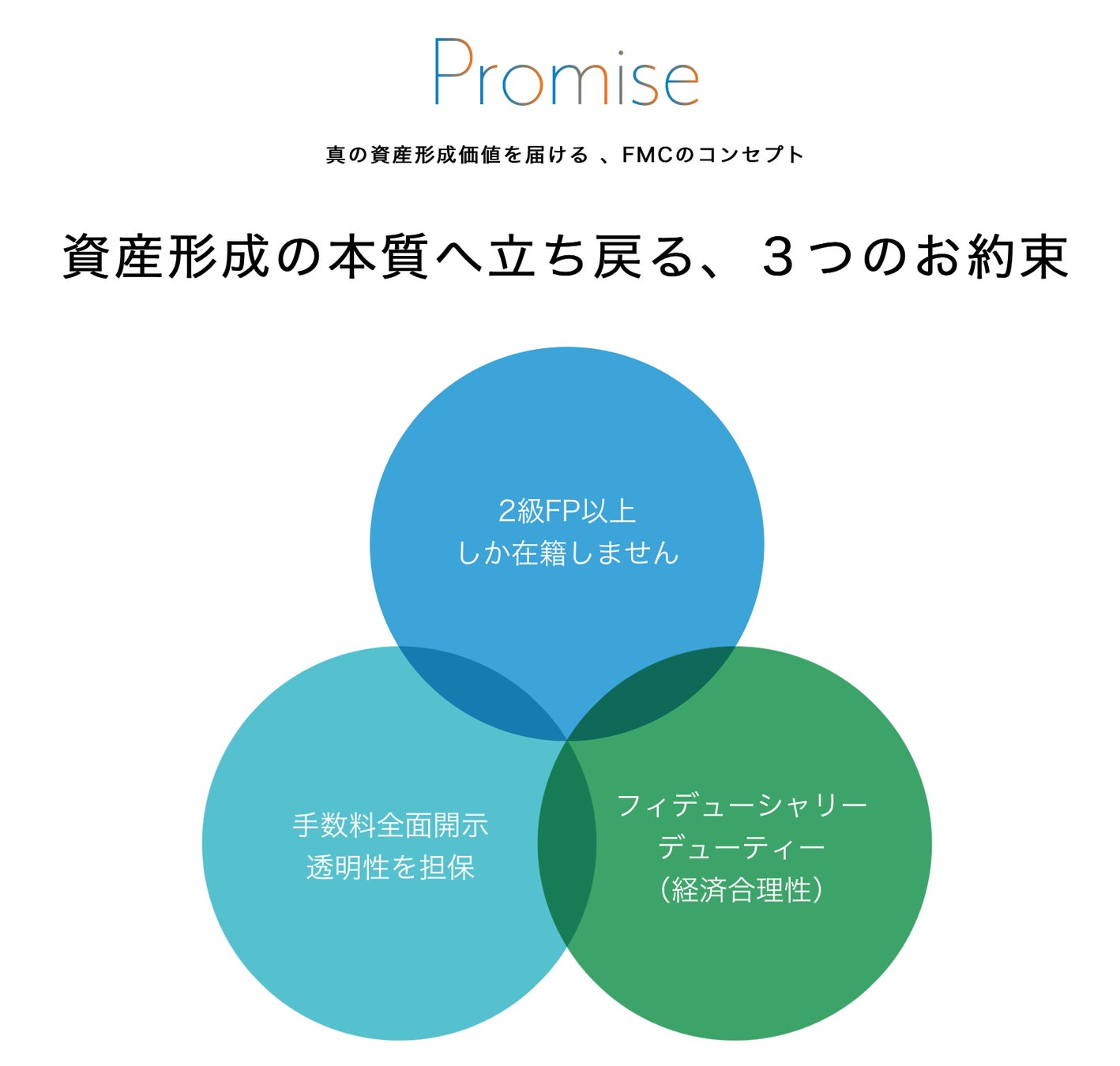 真の資産価値形成を目指すFMCでは、全てのお客様へ三つのお約束をしています。一つ目は、FP2級以上の資格保有者である専門性の高いメンバーのみがお客様をサポートする点です。お客様の大事な資産形成に携わるプロ集団による的確なアドバイスを実現しています。二つ目は、手数料の全面開示による透明性の担保です。金融商品取引法や保険業法上、金融事業者は顧客から得る手数料や保険料の内容を顧客に 情報提供する必要があるとされています。しかし法律で定められている訳ではなく、現状として顧客へ手数料の開示をしていない金融業者も多く存在しています。FMCでは、お客様に分かりやすく正しい情報開示を行うことで、高い信頼構築を目指します。三つ目は、顧客満足度を重視した評価体系です。手数料目的など自分本位の営業活動をしない考え方を社内に取り入れ、またその考えに共感する社員のみで組織を構成することにより、お客様に本質的な資産形成価値を届ける体制を目指しています。