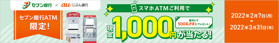 auじぶん銀行株式会社(本社:東京都中央区、代表取締役社長:臼井 朋貴、以下 auじぶん銀行)は、2022年2月7日から2022年3月31日まで、「セブン銀行でスマホATMキャンペーン」(以下 本キャンペーン)を実施します。