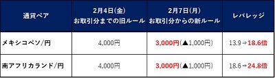 なお、2月7日(月)のお取引より、一部通貨ペアにおいて必要証拠金ルールを変更いたしました。多くの通貨ペアで必要証拠金が減少し、より高い資金効率でお取引頂けます。