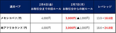 なお、2月7日(月)のお取引より、一部通貨ペアにおいて必要証拠金ルールを変更いたしました。多くの通貨ペアで必要証拠金が減少し、より高い資金効率でお取引頂けます。