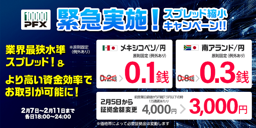 この度スプレッド縮小対象である「南アフリカランド/円」と「メキシコペソ/円」は4,000円→3,000円と25%も必要証拠金が安くなるため、より高い資金効率でお取引頂けるようになりました。