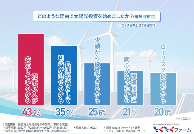今回の調査で、安定した収入や長期的な使役が出る、少額から投資できるといった理由で太陽光投資を始めた方が多いことが分かりました。