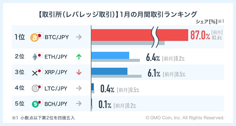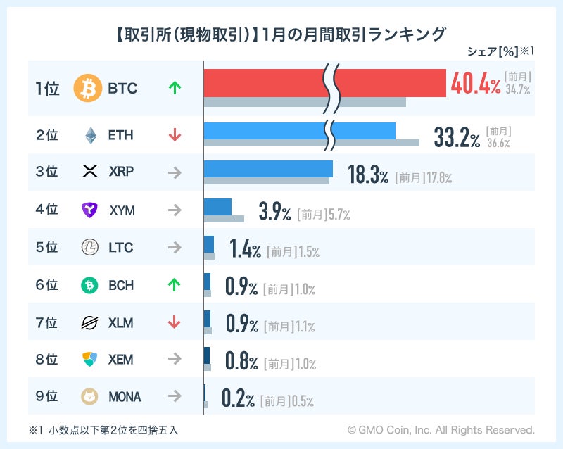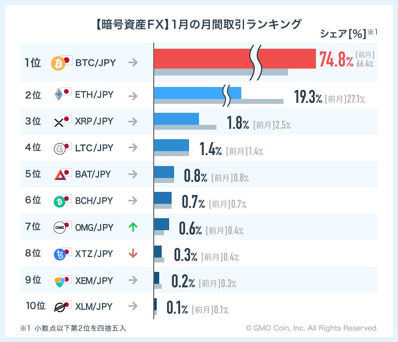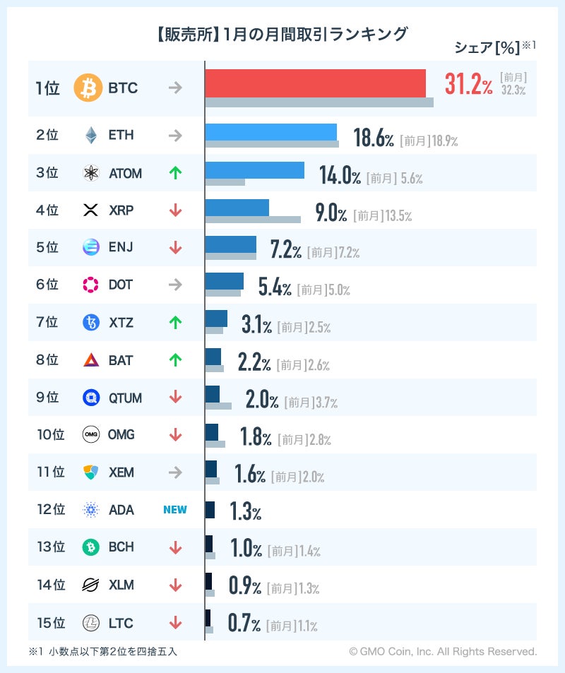 前月12月の取引ランキングと比較すると、以下10銘柄で順位に変動がありました。また1月26日(水)に取り扱いを開始したADAは、シェア1.3%で12位となりました。