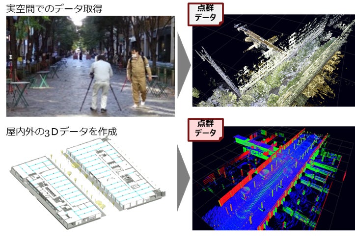 従来のレーザースキャナによる実測から得られる点群データと、屋内外のデータ統合による仮想空間の点群データについて走行シミュレーションを行い、精度を比較。それぞれの点群データと高精度地図を用いて、ロボットが道路上を実走行するテストを行いました。