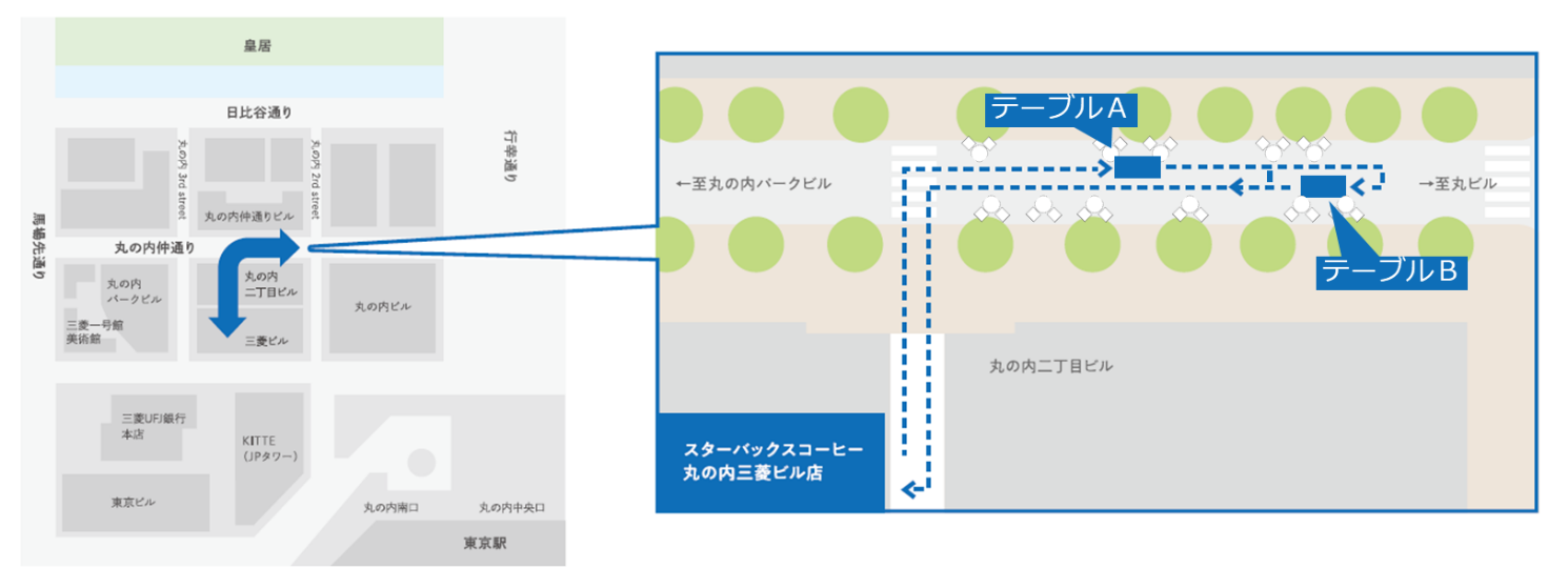 期間中は、丸の内仲通りアーバンテラスに設置された指定のテーブルより、スターバックスコーヒー丸の内三菱ビル店での遠隔注文が可能となり、注文した商品をロボットがテーブルまで配送。大丸有(大手町・丸の内・有楽町)エリアで働くオフィスワーカーや、来街者を中心に約100人が、屋外のテラス席にいながら屋内店舗への遠隔注文とロボットによる配送を体験しました。