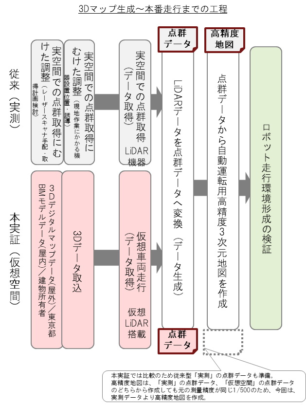 従来のレーザースキャナによる実測から得られる点群データと、屋内外のデータ統合による仮想空間の点群データについて走行シミュレーションを行い、精度を比較。それぞれの点群データと高精度地図を用いて、ロボットが道路上を実走行するテストを行いました。
