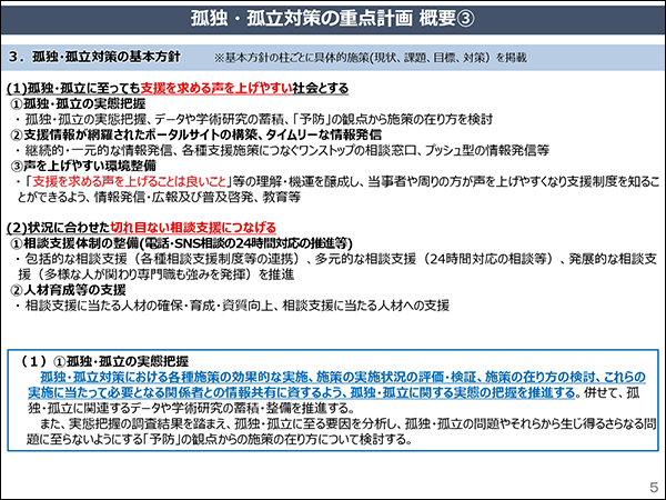 防ぐためにも支援を求めやすい社会・切れ目ない相談支援といった予防の大切さや、政府の具体的な取組に