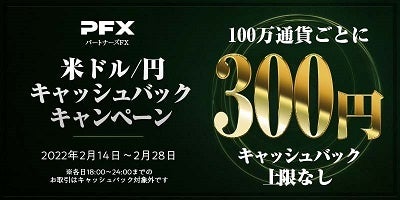 株式会社 マネーパートナーズ(代表取締役社長:福島秀治、本社:東京都港区、以下「当社」)では、2月14日午前7時より『パートナーズFX』で、2月の高額キャッシュバック キャンペーン第2弾を実施しております。対象は、以下の3通貨ペアです。