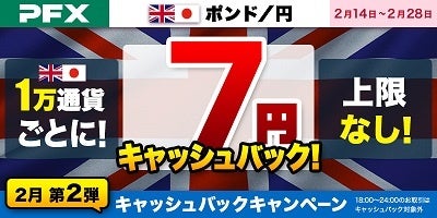 期間中の『パートナーズFX』「 ポンド/円」の新規・決済約定数量の合計に対して、1万通貨ごとに7円、上限なしでキャッシュバックいたします。