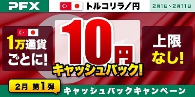 期間中の『パートナーズFX』 「トルコリラ/円」の新規・決済約定数量の合計に対して、1万通貨ごとに10円、上限なしでキャッシュバックいたします。