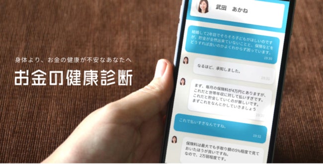 スマホから居住地や年齢、年収、家族構成などの質問に答えるだけで、同地域・同年代の人と比較し、ユーザーの家計状況を診断。自分と似たユーザーと貯金額や投資額を比較して傾向などを受け取ることができます。その後、診断結果をもとにFP(ファイナンシャルプランナー)やIFA(金融商品仲介業者)等のお金に関する専門家からアドバイスコメントが届き、ユーザーはチャットで気軽に無料相談することができます。