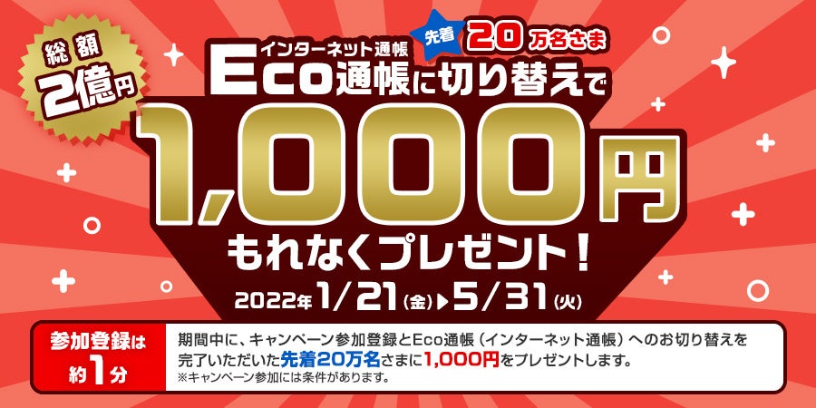 ・紙の通帳からEco通帳(個人向けインターネット通帳)への切り替えを、総額2億円の現金還元で後押し(先着20万人名さまに1,000円の還元)