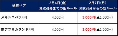 この度スプレッド縮小対象である「南アフリカランド/円」と「メキシコペソ/円」は前営業日の終値(BID)が5円超7.5円以下であれば、従来は4,000円だった必要証拠金が3,000円と25%も安くなるため、より高い資金効率でお取引頂けるようになりました。