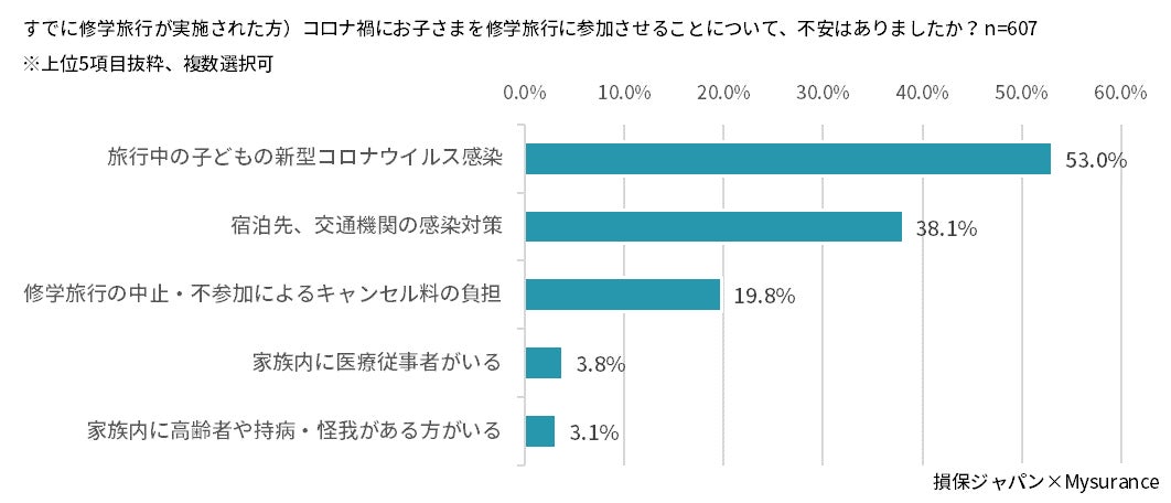 参加させた際の不安TOP「旅行中の子どもの新型コロナウイルス感染(53.0%)「宿泊先、交通機関の感染対策(38.1%)「修学旅行の中止・不参加によるキャンセル料の負担(19.8%)」