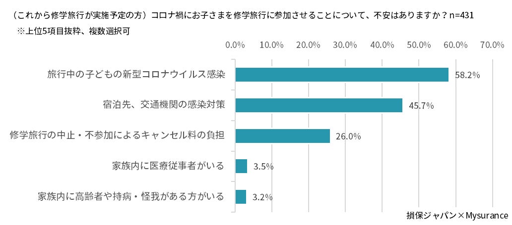 これから参加させる際に不安なことTOPは「旅行中の子どもの新型コロナウイルス感染(58.2%)「宿泊先、交通機関の感染対策(45.7%)「修学旅行の中止・不参加によるキャンセル料の負担26.0%