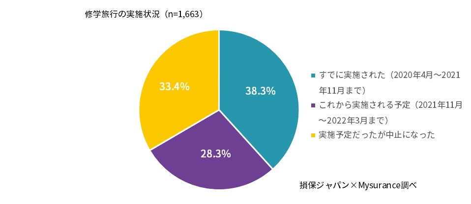 コロナ禍で修学旅行が中止になったと回答した保護者は33.4%実施された38.3%これから実施予定28.3%
