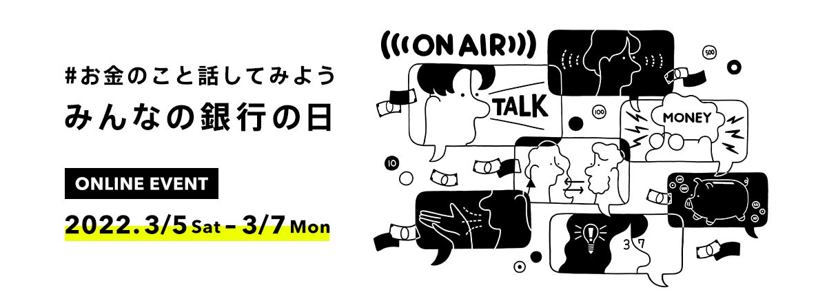 株式会社みんなの銀行(取締役頭取 横田 浩二、以下「みんなの銀行」)は、3と7で「みん(3)な(7)」と読む語呂合わせから、毎年3月7日を「みんなの銀行の日」とし、自分らしく生きるためのお金との付き合い方を考えるきっかけづくりを行なっています。2021年に認定されてから2年目となる今年は、2022年3月5日(土)~7日(月)の期間、「#お金のこと話してみよう みんなの銀行の日 オンラインイベント」を開催します。