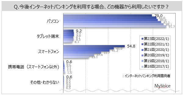 インターネットバンキング利用意向者に、今後どの機器から利用したいかを聞いたところ(複数回答)、「パソコン」が79.0%です。「スマートフォン」は54.8%で、過去調査と比べて増加傾向です。「タブレット端末」は9.2%となっています。『auじぶん銀行』『セブン銀行』主利用者では、「スマートフォン」が「パソコン」を上回り1位です。