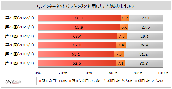 インターネットバンキングの利用経験者は7割強となっています。現在利用している人は66.2%、2018年調査以降微増傾向です。