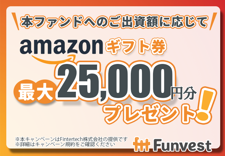 また、本ファンドに投資していただいた投資家の皆様を対象として、出資額に応じて最大25,000円分のAmazonギフト券を進呈するキャンペーン」も併せて実施いたします。
