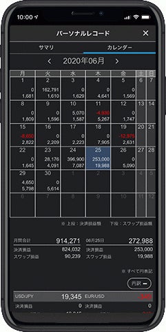 セントラル短資FXのスマホアプリは、取引成績を包括的・直感的に把握できるよう、取引履歴がカレンダー形式で表示されます。