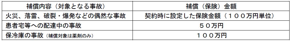 本制度は、一般的な火災保険では補償されない薬剤の配達中の事故による損傷や、保冷庫の温度設定ミスや自然災害等に起因した停電による保冷庫の機能停止を原因とした薬剤の損傷を補償します。