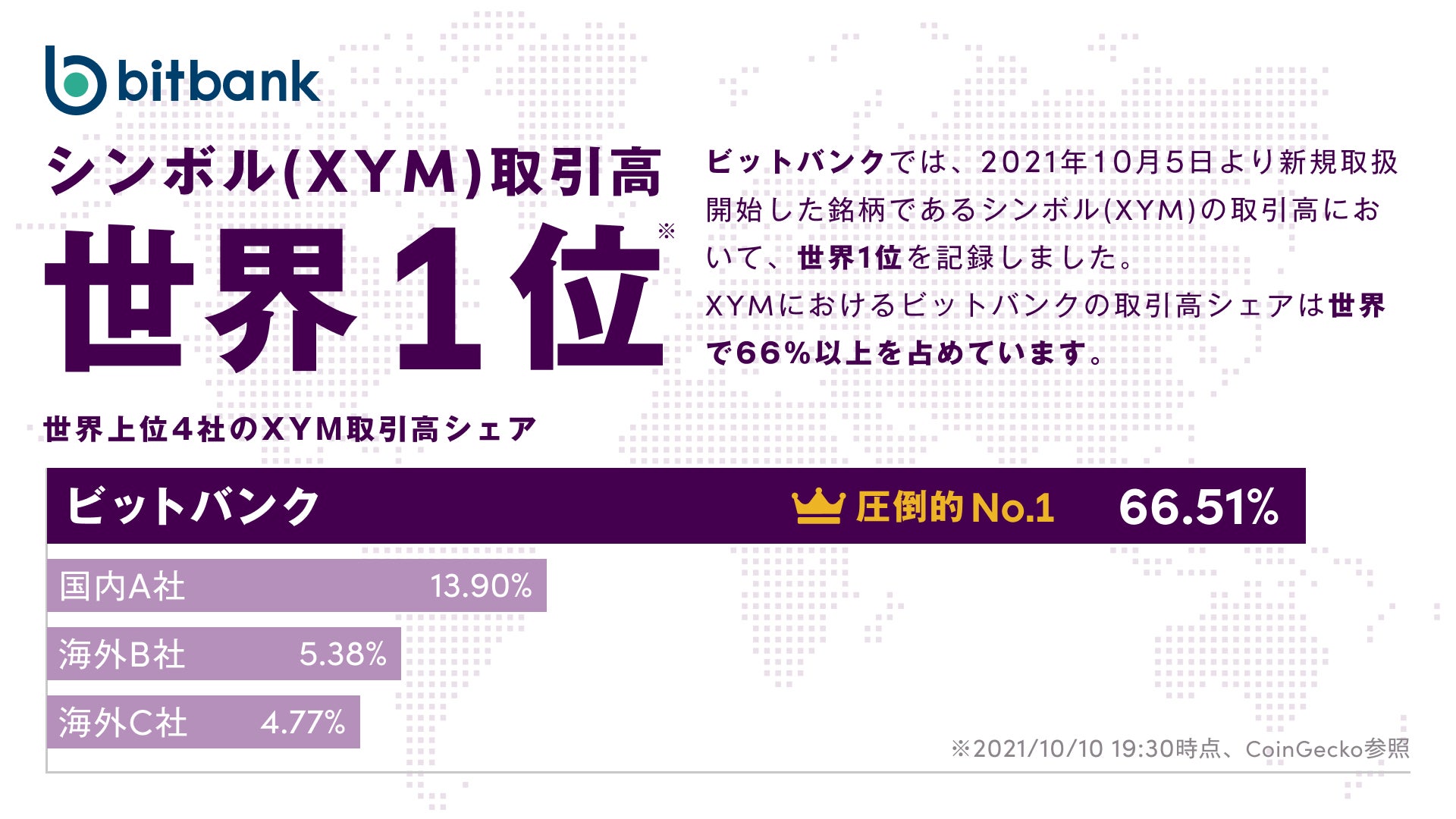ビットバンクは2021年10月5日にXYM取扱い開始以来、多くの皆さまにご支持いただき、XYMの取引高世界1位を達成することができました。