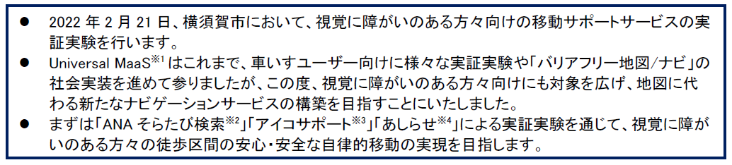 全日本空輸株式会社(本社:東京都港区、代表取締役社長:平子裕志、以下「ANA」)、横須賀市(市長:上地克明、以下「横須賀市」)、損害保険ジャパン株式会社(本社:東京都新宿区、代表取締役社長:西澤敬二、以下「損保ジャパン」)、株式会社プライムアシスタンス(本社:東京都中野区、代表取締役社長:大木雅人、以下「プライムアシスタンス」)、株式会社Ashirase(本社:東京都西東京市、代表取締役CEO:千野 歩、以下「Ashirase」)、ANAウィングフェローズ・ヴイ王子株式会社(本社:東京都大田区、代表取締役社長:汐見啓介、以下「AWO」)は、国土交通省の「令和3年度日本版MaaS推進・支援事業」の採択内容に基づき、2022年2月21日に、視覚に障がいのある方々向けの移動サポートの実証実験を横須賀市で行います。