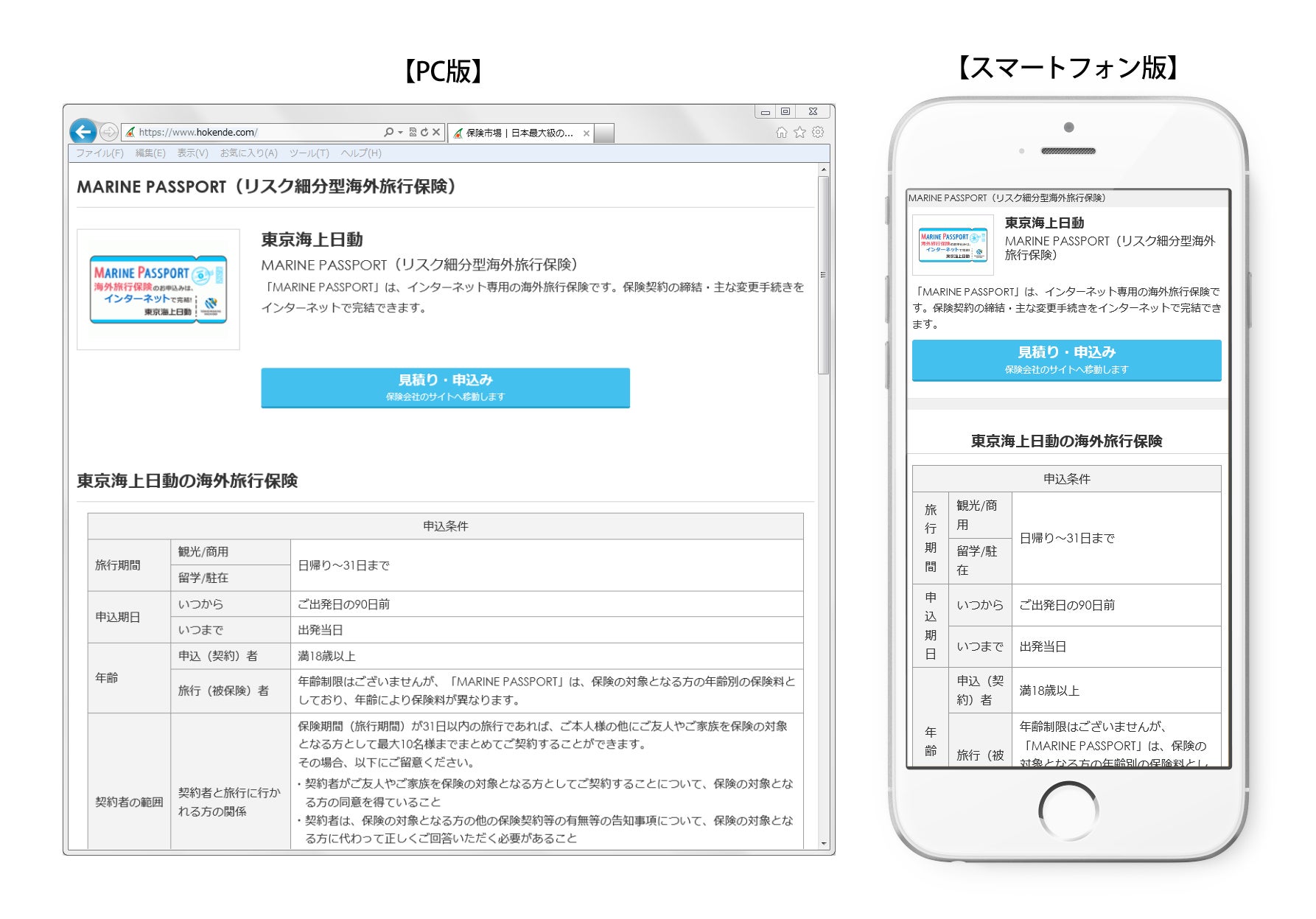 保険選びサイト「保険市場」に掲載を開始した『MARINE PASSPORT(リスク細分型海外旅行保険)』は、インターネットでお申し込みいただける保険商品です。「保険市場」PCサイトおよびスマートフォンサイトにて、商品の詳細をご確認いただけます。