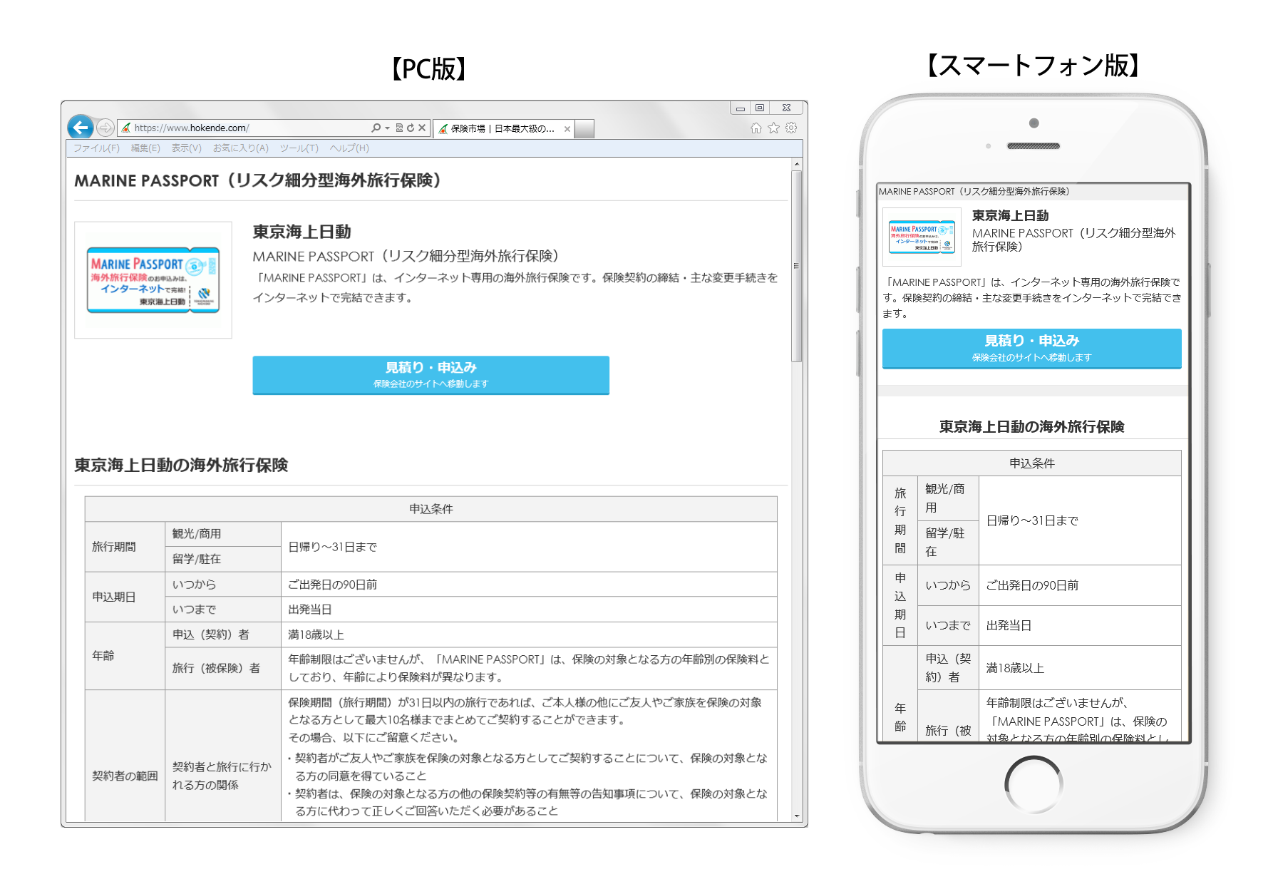 保険選びサイト「保険市場」に掲載を開始した『MARINE PASSPORT(リスク細分型海外旅行保険)』は、インターネットでお申し込みいただける保険商品です。「保険市場」PCサイトおよびスマートフォンサイトにて、商品の詳細をご確認いただけます。