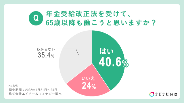 そこで、「今回の年金受給改正法を受けて、65歳以降も働こうと思いましたか?」と質問したところ、「はい」と回答した人が40.6%と最も多い結果となりました。