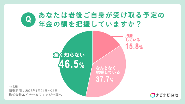 また、「老後、自身が受け取る年金の額を把握していますか?」という質問に対しても、46.5%もの人が「全く知らない」と回答しました。