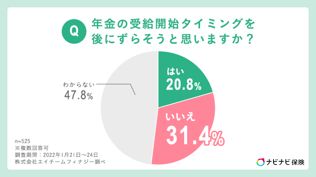 一方で、「年金の受給開始タイミングを後にずらそうと思いますか?」という質問に対しては、「はい」が20.8%、「いいえ」が31.4%という結果に。