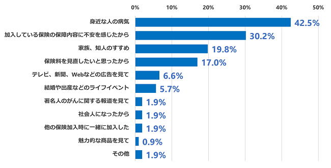 - がん保険の加入/見直しのきっかけ:「身近な人の病気」がきっかけの方が多い