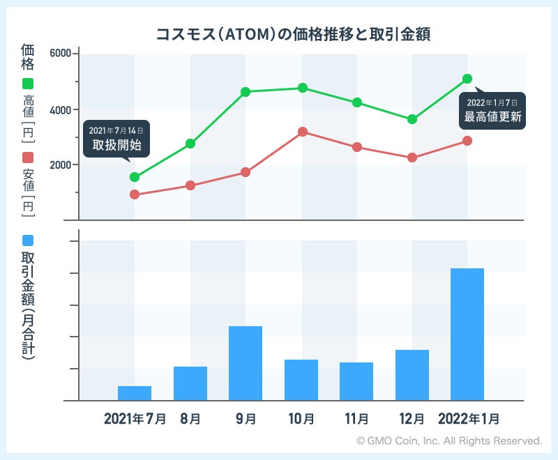 2021年7月に始値1,298円をつけたコスモス(ATOM)は10月にかけて上昇しました。その後やや下落しますが、2022年1月7日にはGMOコインで取り扱いを開始した2021年7月14日の始値1,176円の4倍以上となる5,067円をつけ、史上最高値を更新しました。