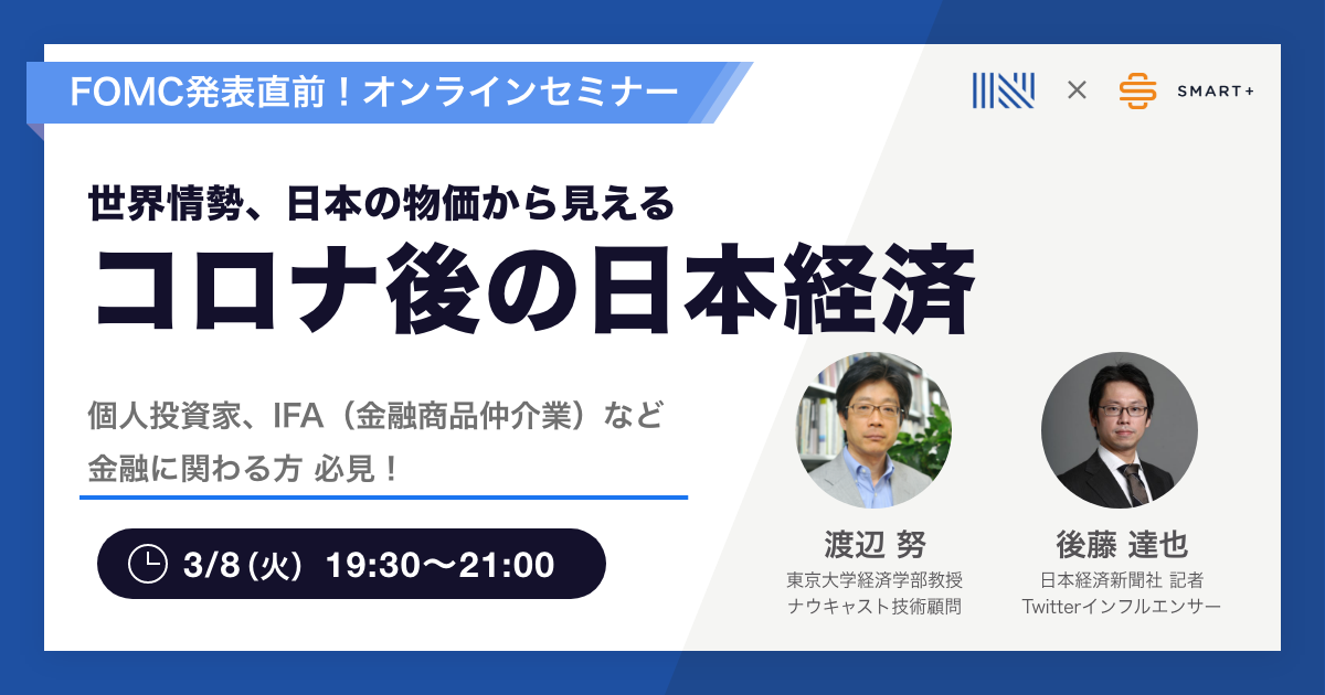 株式会社Finatextホールディングス(代表取締役社長 CEO:林 良太)の子会社で証券事業を展開する株式会社スマートプラス(本社:東京都千代田区、代表取締役:藤江 典雄)とオルタナティブデータ企業である株式会社ナウキャスト(本社:東京都千代田区、代表取締役CEO:辻中 仁士、以下 ナウキャスト)は、3/8(火) 19時30分〜 日本経済新聞社 記者 / Twitterインフルエンサー 後藤 達也氏と東京大学経済学部教授 / ナウキャスト技術顧問 渡辺 努氏による「FOMC発表直前!世界情勢、日本の物価から見るコロナ後の日本経済」を開催いたします。