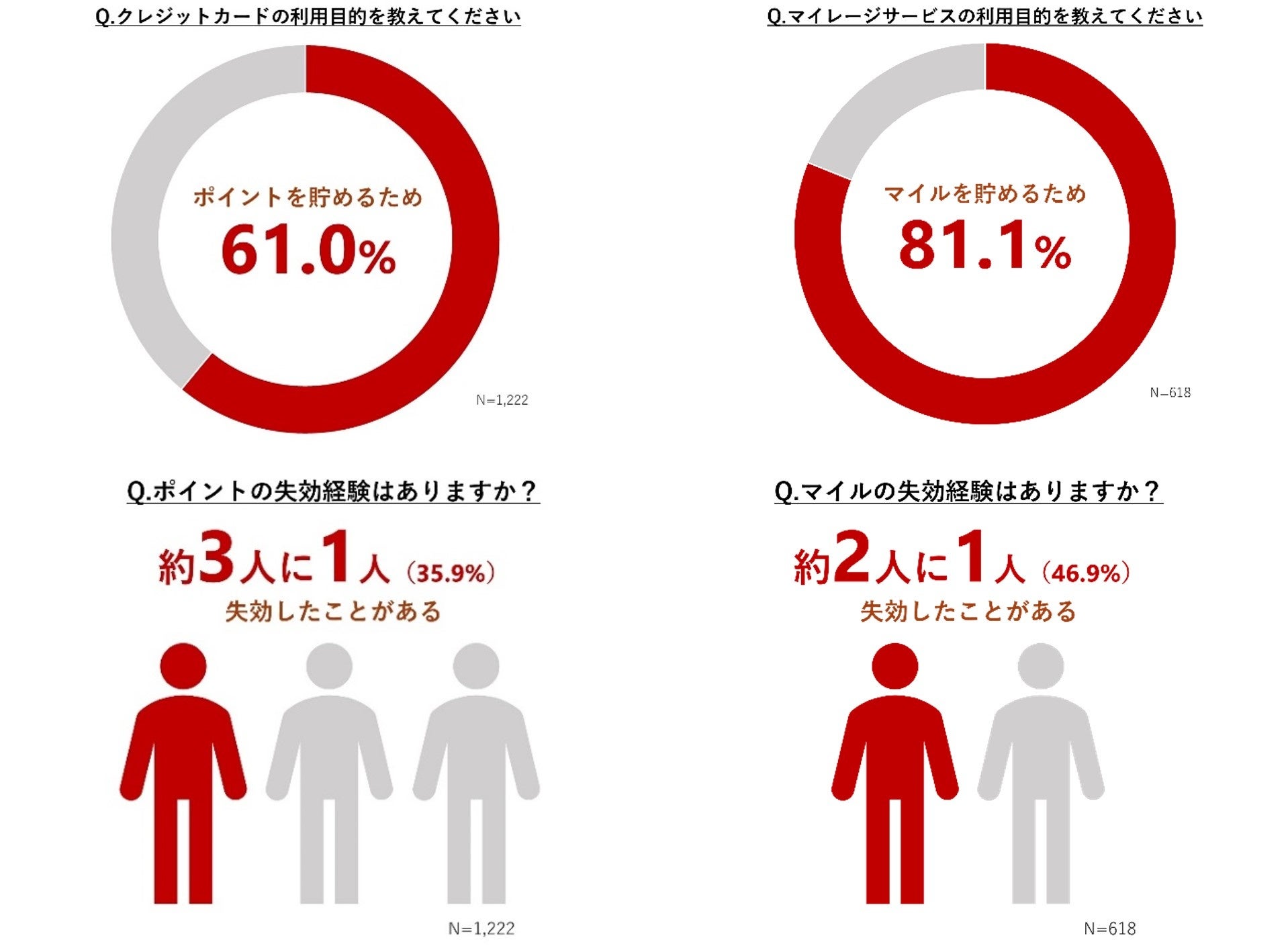 - 利用目的として、クレジットカードでは約6割、マイレージサービスでは約8割が「ポイントを貯めるため」と回答。しかし、クレジットカードでは約3人に1人が、マイレージサービスでは約2人に1人がポイントの失効経験があると判明。