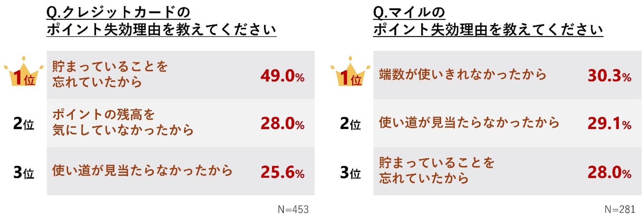 - ポイントの失効理由は、クレジットカードでは「貯まっていることを忘れていたから」、マイルでは「端数が使いきれなかったから」がそれぞれ最多。