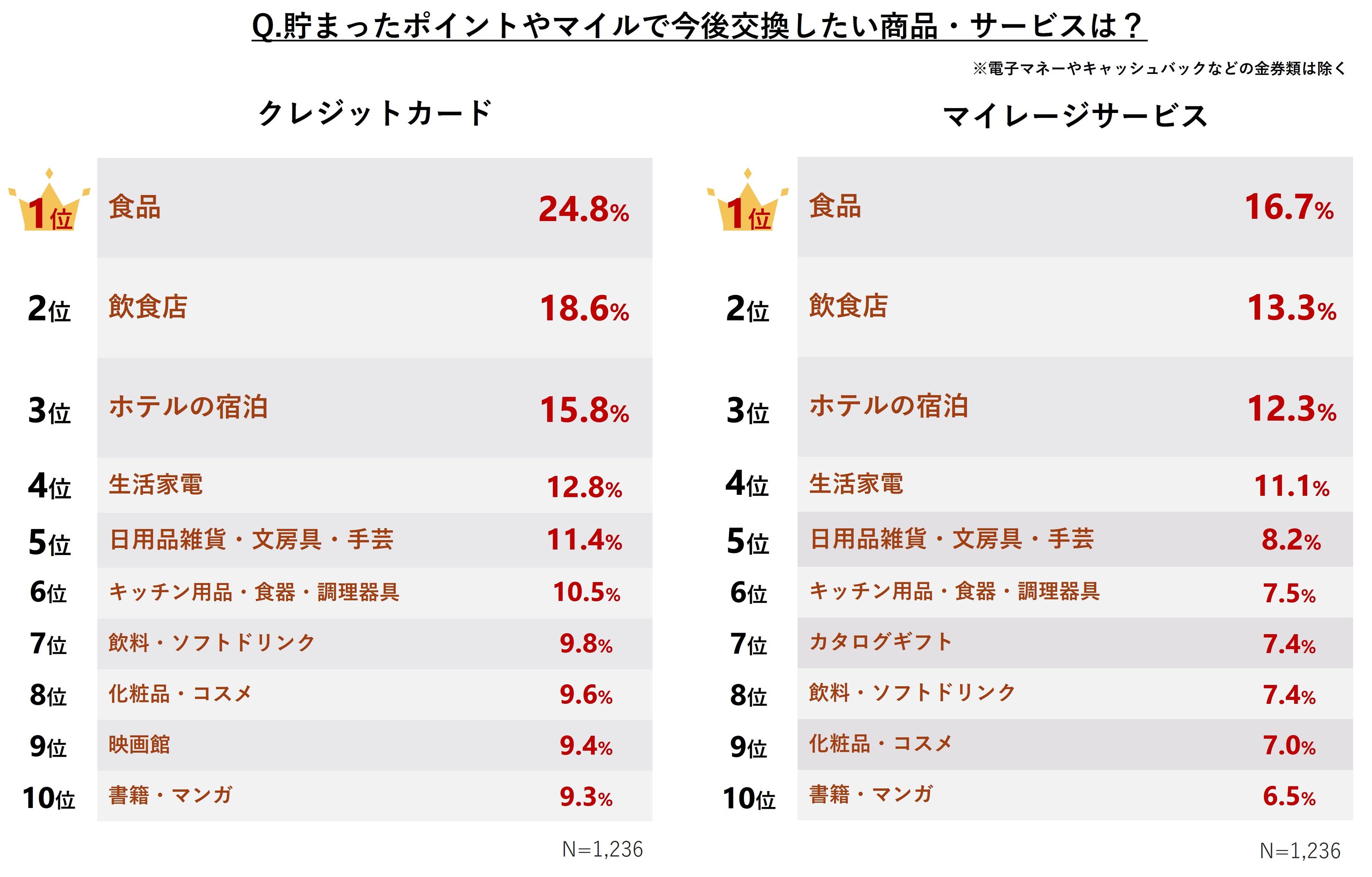 - 今後ポイント交換したい商品・サービスは、金券類以外ではクレジットカードとマイレージサービスともに「食品」「飲食店」「ホテルの宿泊」の順で人気の傾向に。