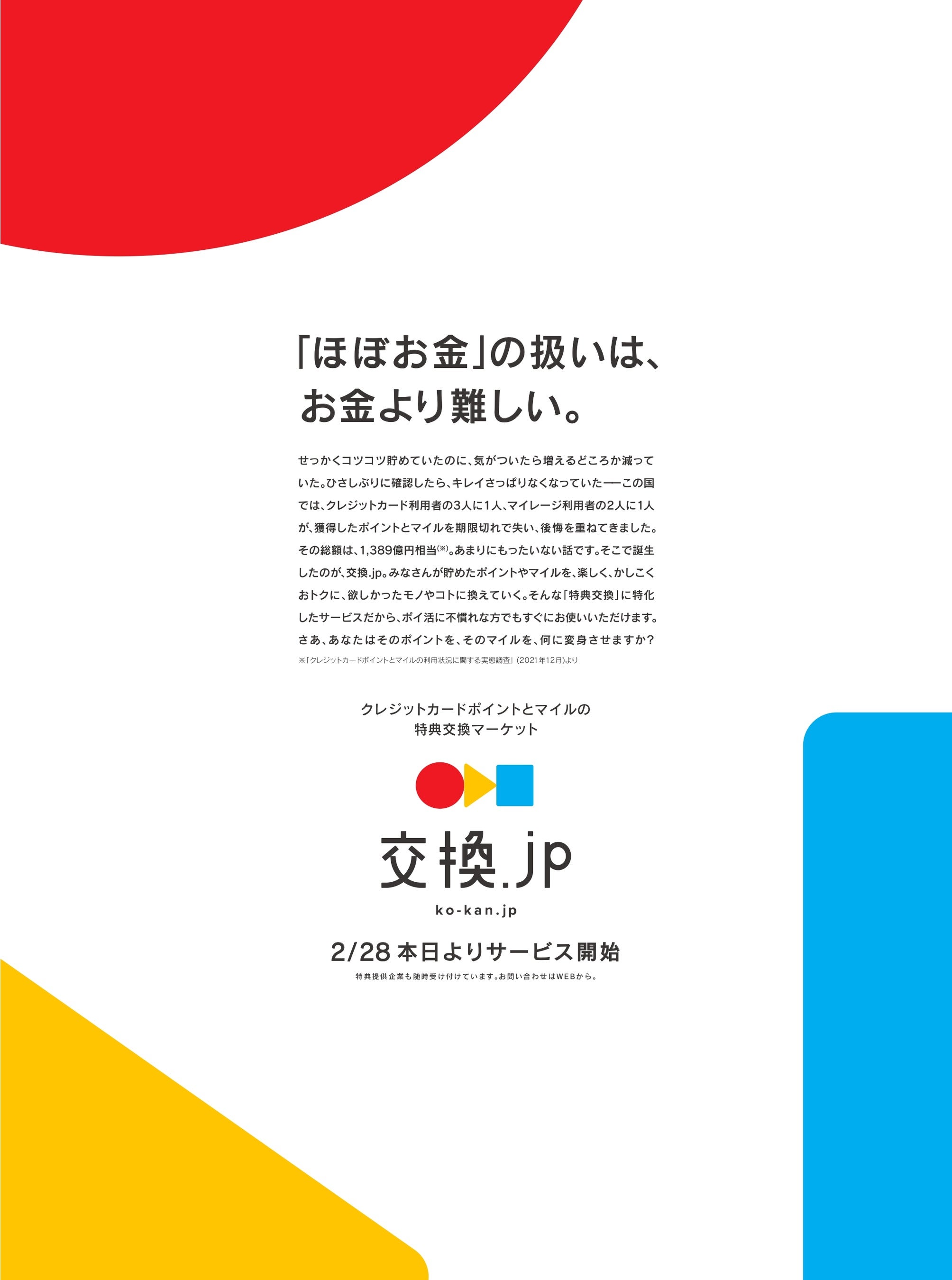 本リニューアルに合わせて、2月28日(月)に本調査を踏まえた広告を西日本新聞において公開いたします。本新聞広告では、『「ほぼお金」の扱いは、お金より難しい。』 から始まるメッセージで、せっかく貯めてきたポイントやマイルを失うことなく、楽しく、かしこく、おトクに特典に交換してほしいという「交換.jp」の想いを綴っています。