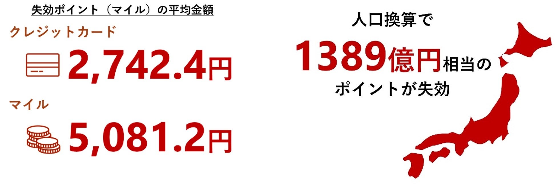 - 失効したポイント平均金額はクレジットカードで2,742.4円相当、マイルが5,081.2円相当。合計でおよそ「1,389億円相当」が失われている計算に!