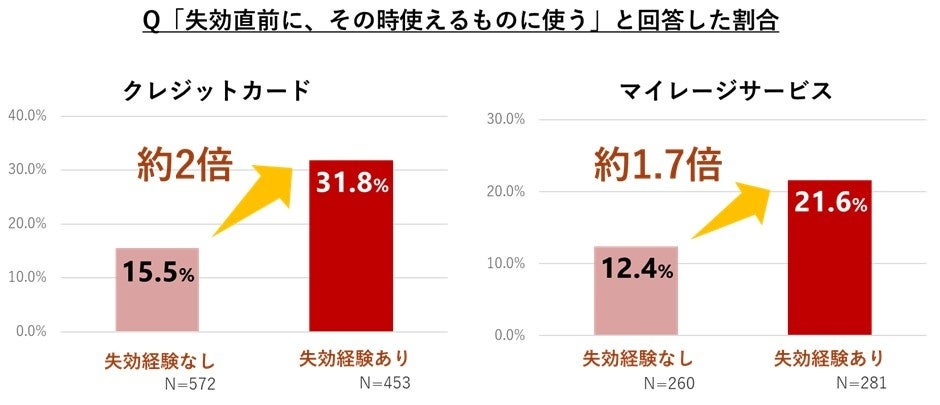 ポイント・マイル失効経験のある方、ない方の本質問の回答を比較したところ、ポイント活用のヒントが見えてきました。まず、失効経験がある人は、「失効直前に使う」傾向にあり、ポイント使用を先延ばししがちな傾向が分かりました。一方で失効経験がない人は、「目標を定めて使っている」と答えた人が多い傾向がありました。特にクレジットカード利用者では、失効経験ありの人が約32%、なしの人が約16%と約2倍の差がついています。ポイントは失効期限まで待つのではなく、交換したいものを都度見つけてこまめに交換していく方がよいと言えるでしょう。