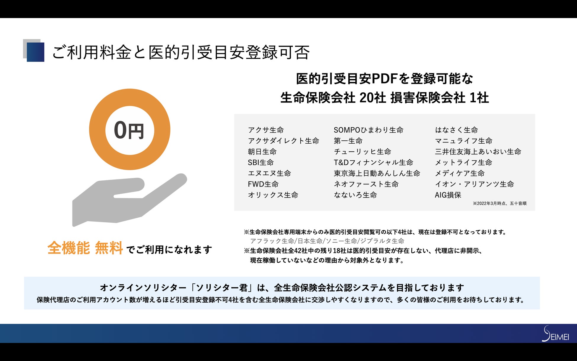 各保険会社の医的引受目安PDFもユーザー自身でアップロードすることが可能であり、リーガル面でも問題ないことを顧問弁護士に確認済みですが、登録可能な保険会社がどこかという問い合わせを頂くことが多く、今回上記スライドにて明記させて頂きました(2022年3月時点)